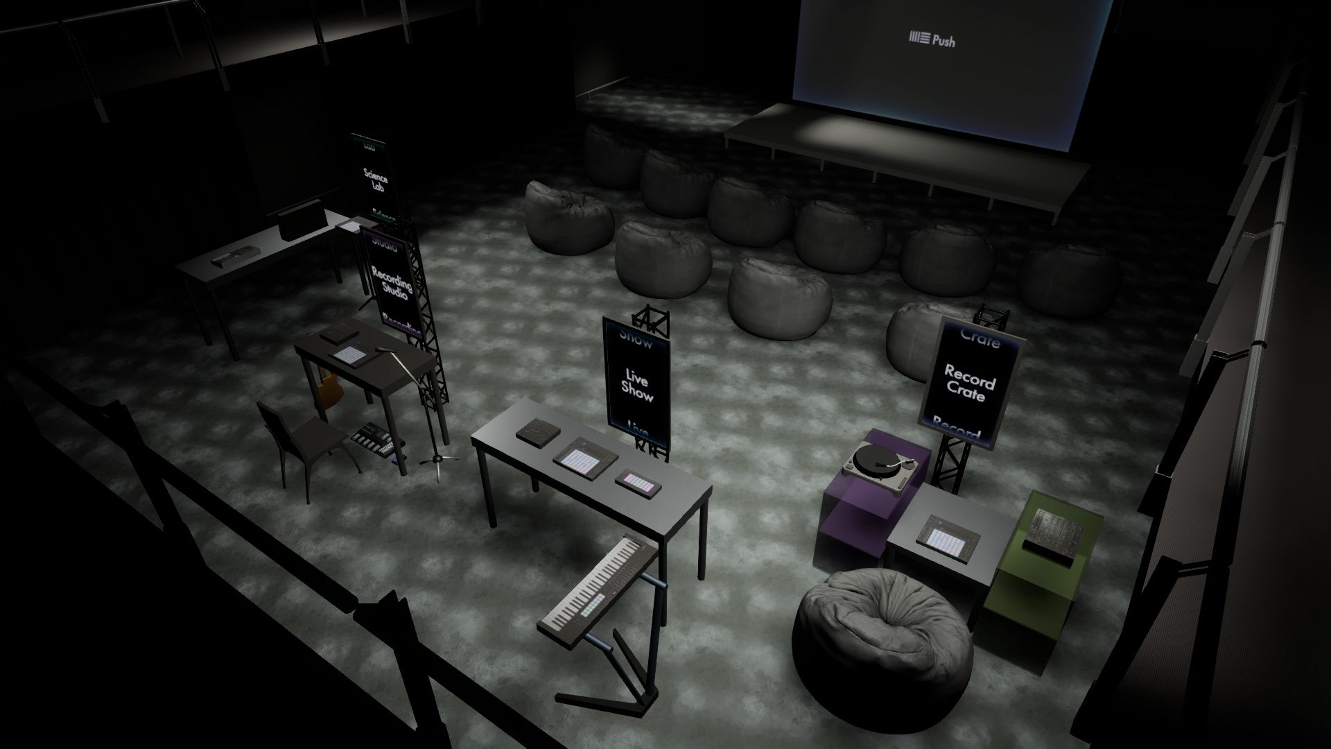 Lighting design for Ableton x MUTEK Push3 event at Studio Hydro-Québec. Work with in-house tech director to develop full rendered scenes using Capture Visualization and different light fixtures. Modeled and created custom 3D objects for the stage setup using Blender.
